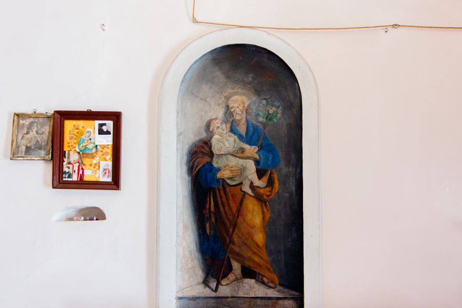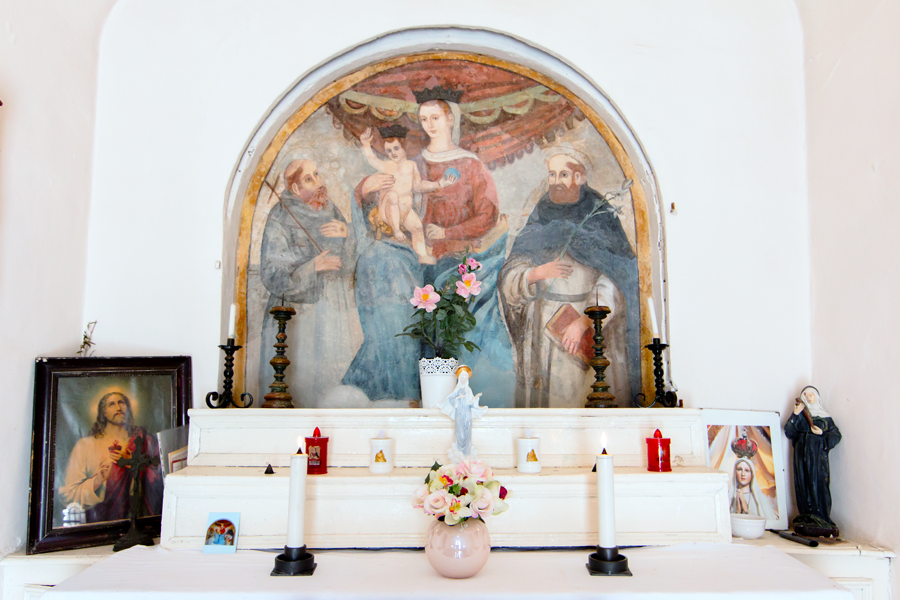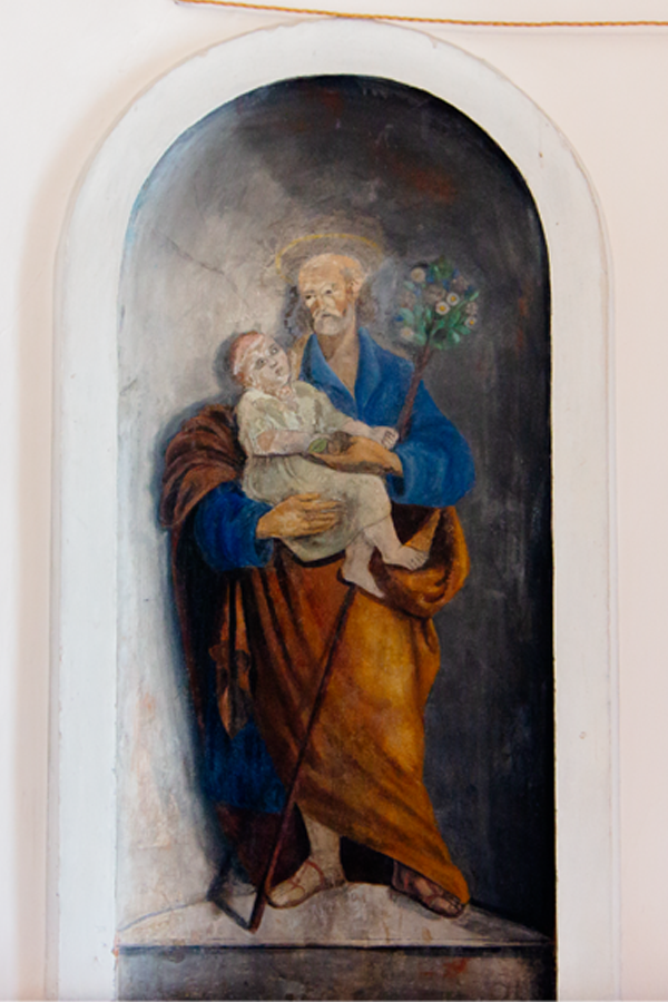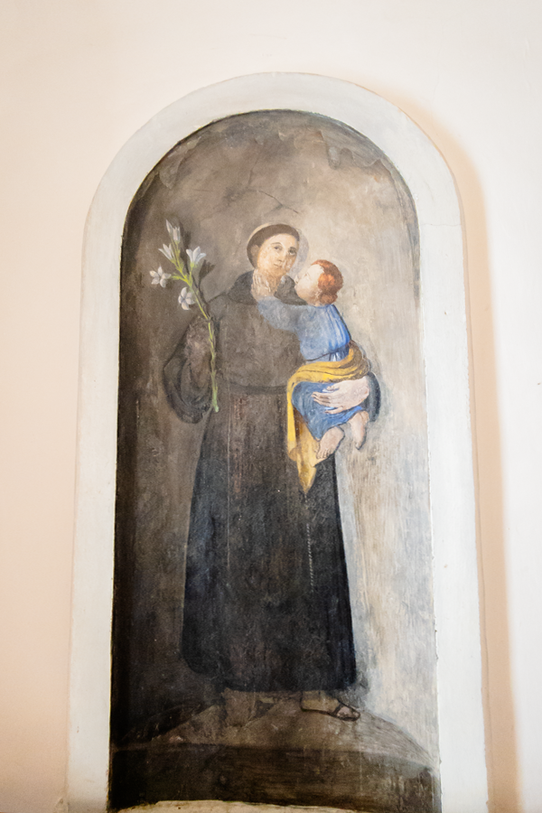 All’interno si trovano tre affreschi di grande valore: al centro, una Madonna con Bambino tra San Domenico e San Francesco, venerata nei secoli con ex voto e coroncine; ai lati, le figure di Sant’Antonio da Padova e San Giuseppe, con simboli del Bambin Gesù. Un luogo di devozione e storia, perfetto per una visita.