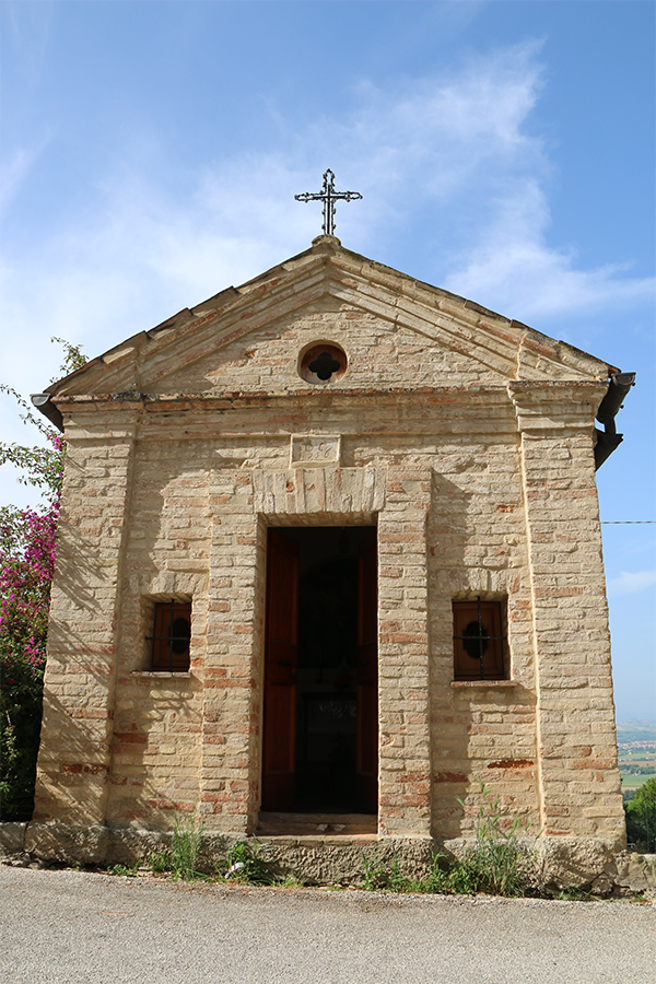 La chiesa della Madonna di S. Domenico si trova appena al di fuori della cinta muraria trecentesca di Montecosaro, in prossimità dell’ormai scomparsa Porta di S. Giovanni. Da qui si domina su un esteso tratto della bassa Val di Chienti e dalle contrade sottostanti giungono solo rumori e odori di vita campestre. La minuscola struttura sorge in un sito tranquillo ed assolato, dove verso la metà del ‘500 venne edificata un’edicola votiva. Solo in seguito, intorno all’anno 1742, il piccolo manufatto venne trasformato nella chiesa attuale. La data del 1756 incisa sopra l’ingresso, dovrebbe quindi corrispondere ad una semplice risistemazione o ad un primo abbellimento dell’impianto. All’interno vi sono tre affreschi: quello centrale è stato realizzato verso la metà del ‘500 e riproduce una Madonna con Bambino tra S. Domenico e S. Francesco. L’immagine fu veneratissima nei secoli passati, tanto che nonostante svariate visite di scrupolosi ladri di opere d’arte, vi sono ancora apposti diversi ex voto e coroncine. Nei due affreschi laterali figurano invece S. Antonio da Padova e S. Giuseppe, con in mano degli oggetti che simboleggiano il Bambin Gesù, rispettivamente un giglio ed un bastone fiorito.