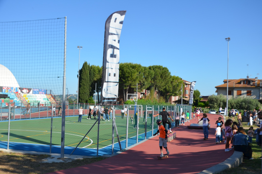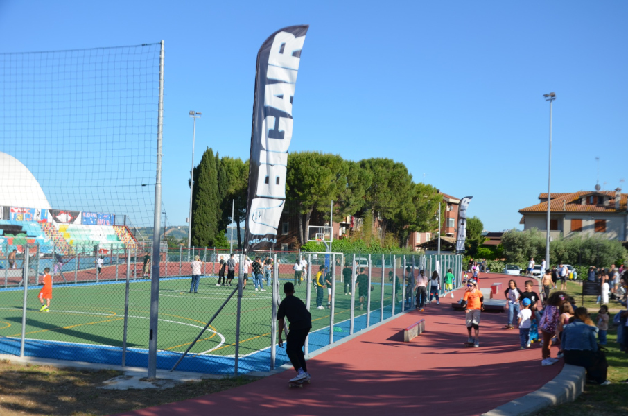 L’intera struttura è stata dedicata a Mattia Perini, un giovane sportivo scomparso nel 2020. Contestualmente, si è proceduto alla riqualificazione degli impianti sportivi, con un fondo in resina per il campo polivalente (calcetto, basket, pallavolo) e l’illuminazione. Sulla pista di atletica è stato realizzato uno skatepark, inaugurato definitivamente nel maggio 2024. Oggi gli impianti, che includono il campo e lo skatepark, rappresentano un importante centro di aggregazione e riferimento sportivo per i giovani di Montecosaro e dei comuni limitrofi.